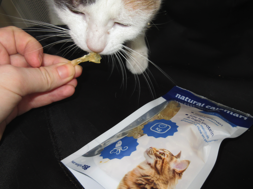 Pour les calamars séchés, un de ses chats a détesté. L’autre en a mangé mais sans passion… et puis elle trouve en prime que cela pue ! Celle-ci ajoute : que l’on soit à deux ou à quatre pattes ici, on n’a pas aimé.