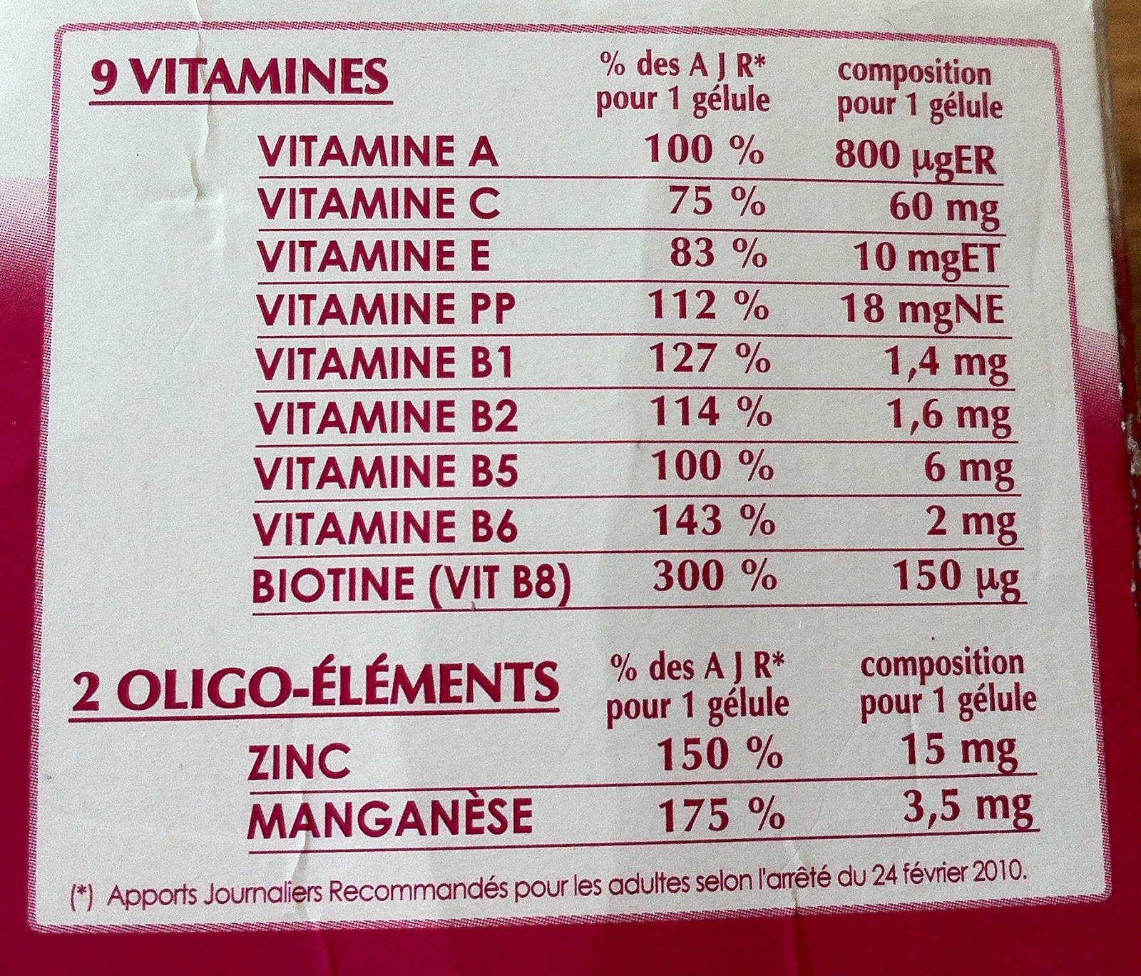 Quelques détails sur le contenu des gélules (vitamines et minéraux) :