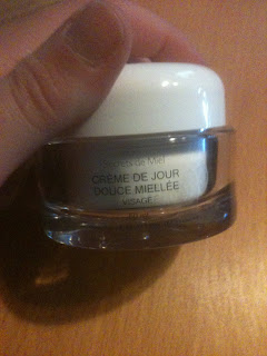 Il s’agit de la crème de jour douceur miellée de Secrets de Miel, onctueuse et dôtée d’une agréable odeur. Cette crème a pour but de nourrir la peau et de l’adoucir. Pendant 24h, la peau est hydratée. Je l’ai testé et j’approuve. Elle ne laisse pas ma peau grasse mais douce.