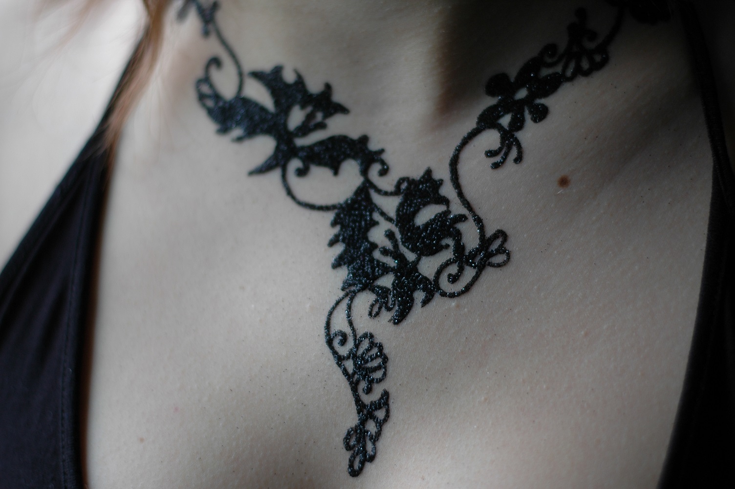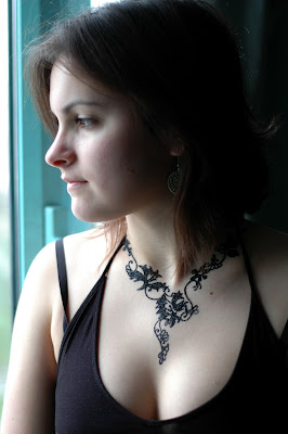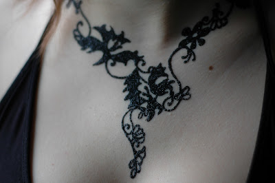 Tout a commencé le 26 mars dernier à Paris, par un après-midi très nuageux. Merci à Stéphanie Zwicky, chroniqueuse beauté/mode pour 100% mag de m’avoir choisie comme modèle (testeuse) du tatouage éphémère bijou par Marty Tatoo. Un tatouage bijou éphémère unique à la poudre de diamants (noire), réalisée par Marty, à partir des broderies de la robe que je portais…