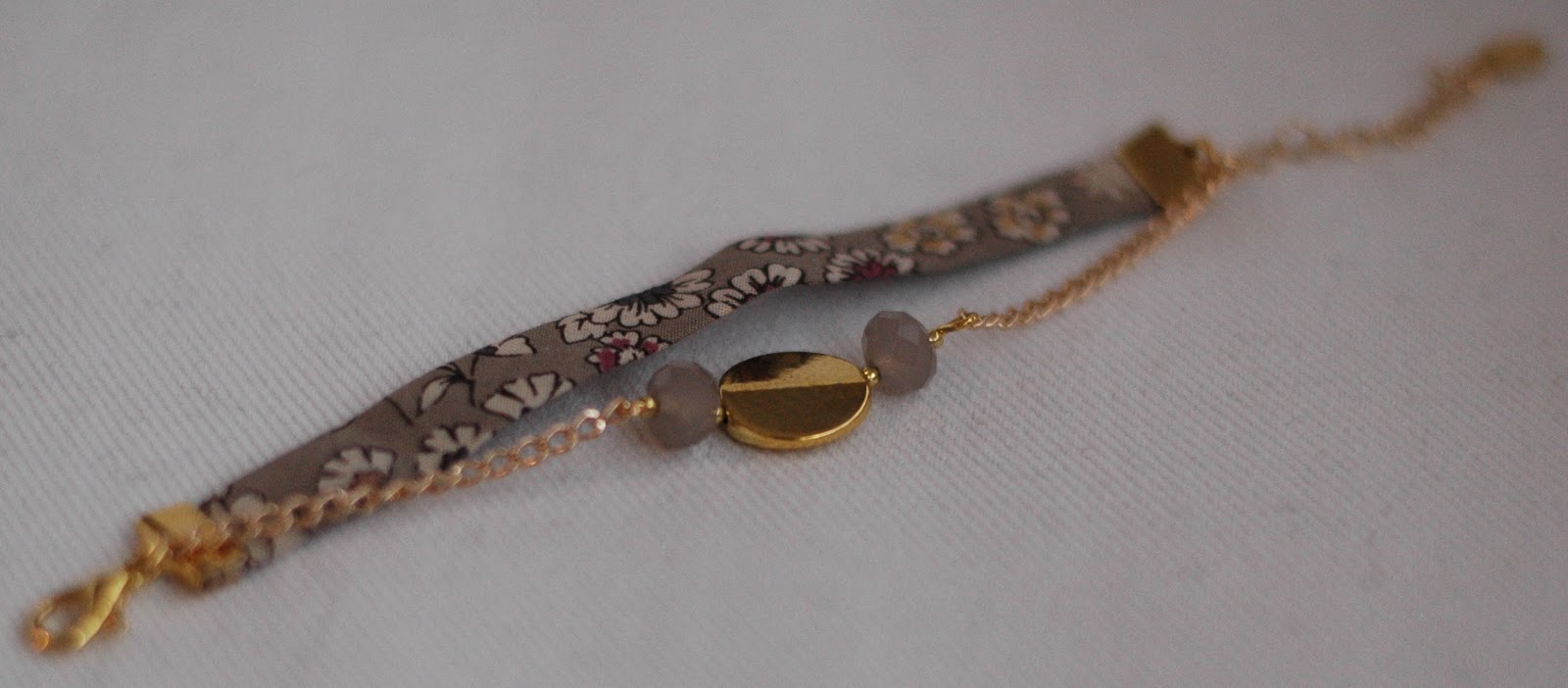 À gagner : Le bracelet sevrine en liberty taupe à motifs fleurs et chaine fine dorée. Au centre de ce bracelet : un trio de perles : une dorée à facettes, deux perles à facettes taupe. Taille réglable (valeur : 15 €).