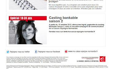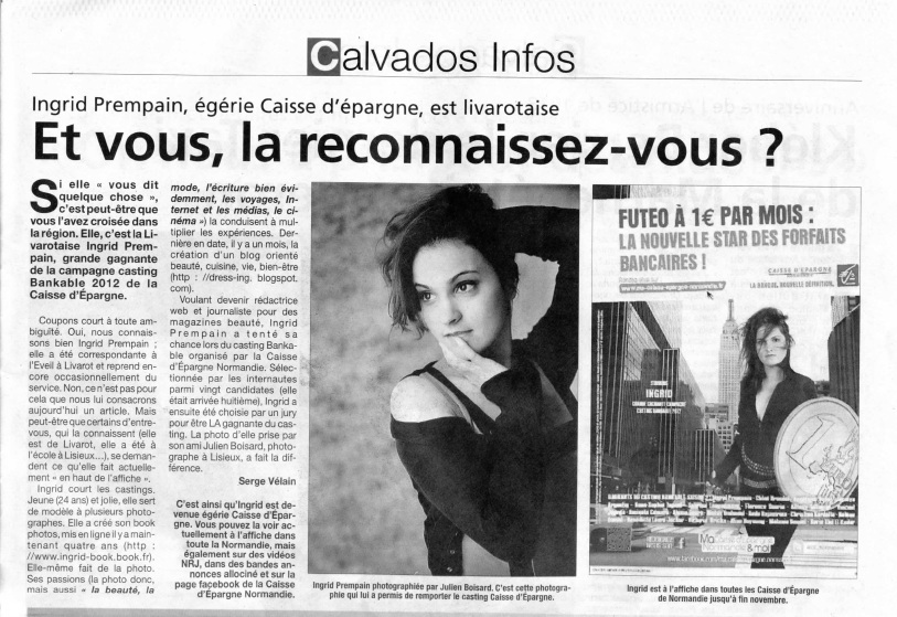 La rentrée ne pouvait pas mieux commencer. Dans un premier temps, j’ai eu la confirmation, le 10 septembre dernier, par la Caisse d’Epargne de Normandie, que j’étais dans les 20 gagnants du 2ème Casting Bankable organisé sur le Facebook de la Caisse d’Epargne Normandie. Première bonne nouvelle et je remercie encore toutes les personnes qui ont voté pour moi et qui m’ont permis de me classer 8ème sur les 20 premiers !!!! Et j’ai appris le 12 septembre que j’étais choisie par le jury en tant que la nouvelle égérie de La Caisse d’Epargne sur toute la Normandie (flyers, affichages, Internet, vidéos). Beaucoup d’émotions se sont mélangées en moi, surtout de la joie !
